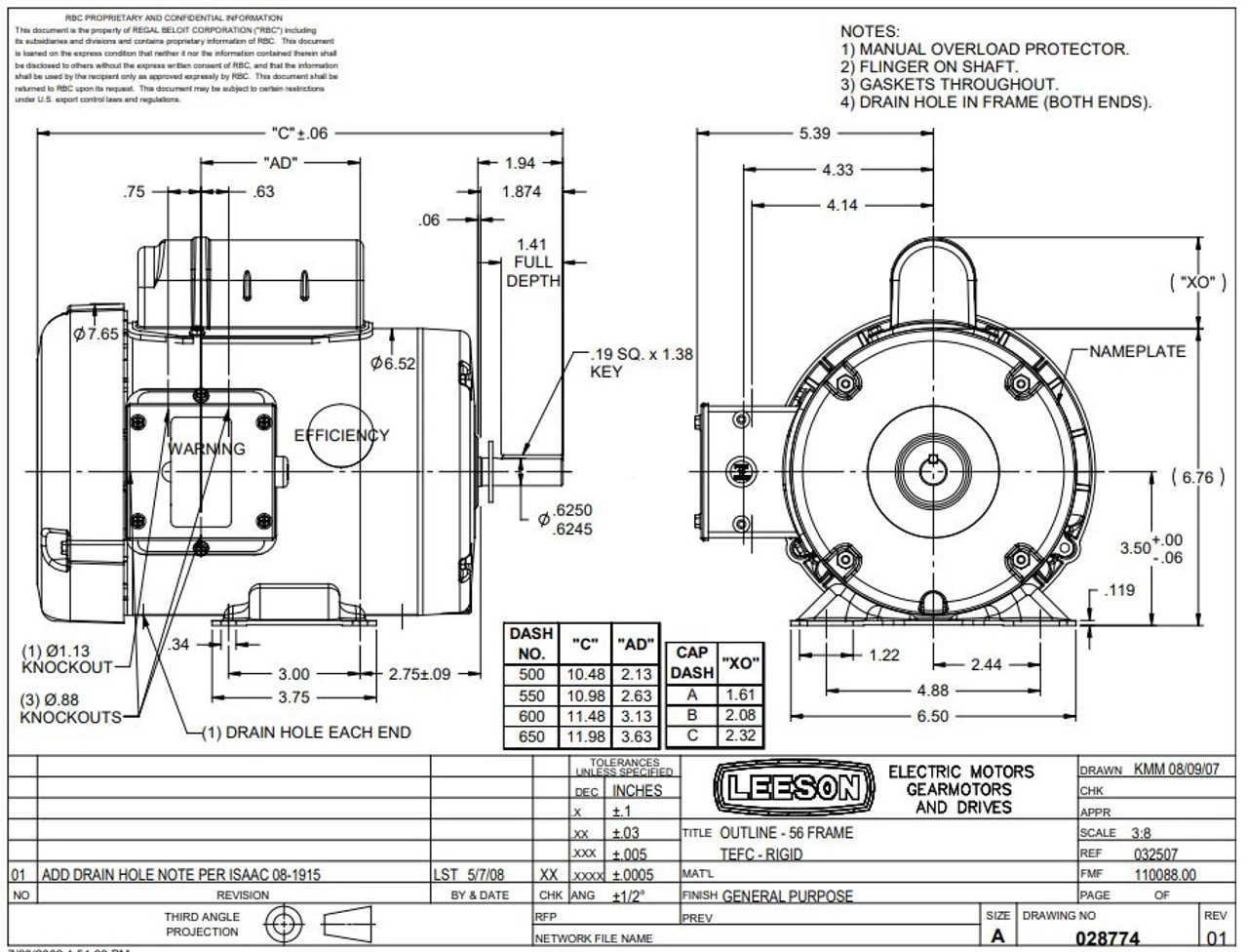 Single Phase Leeson Farm Duty High Starting Torque, Capacitor Start motor. Overall Length = 11.31″ Excellent motor for any application requiring a 3/4 hp motor. This Totally Enclosed motor is Excellent for woodworking machines and other industrial machines where the motor is exposed to saw dust, dirt, oil and other particles in the air that will damage the motor. Motor also has manual overload protection to prevent damage in an overload situation. Mounting is standard NEMA 56 frame, flat base with 4 holes. 3″ x 5″ mounting. Farm duty motors have many extra features over standard motors such as double sealed bearings with Exxon grease for a temperature range of -20F to +350F. Rubber boot over reset button provides additional protection. Gasketed junction box and capacitor covers.