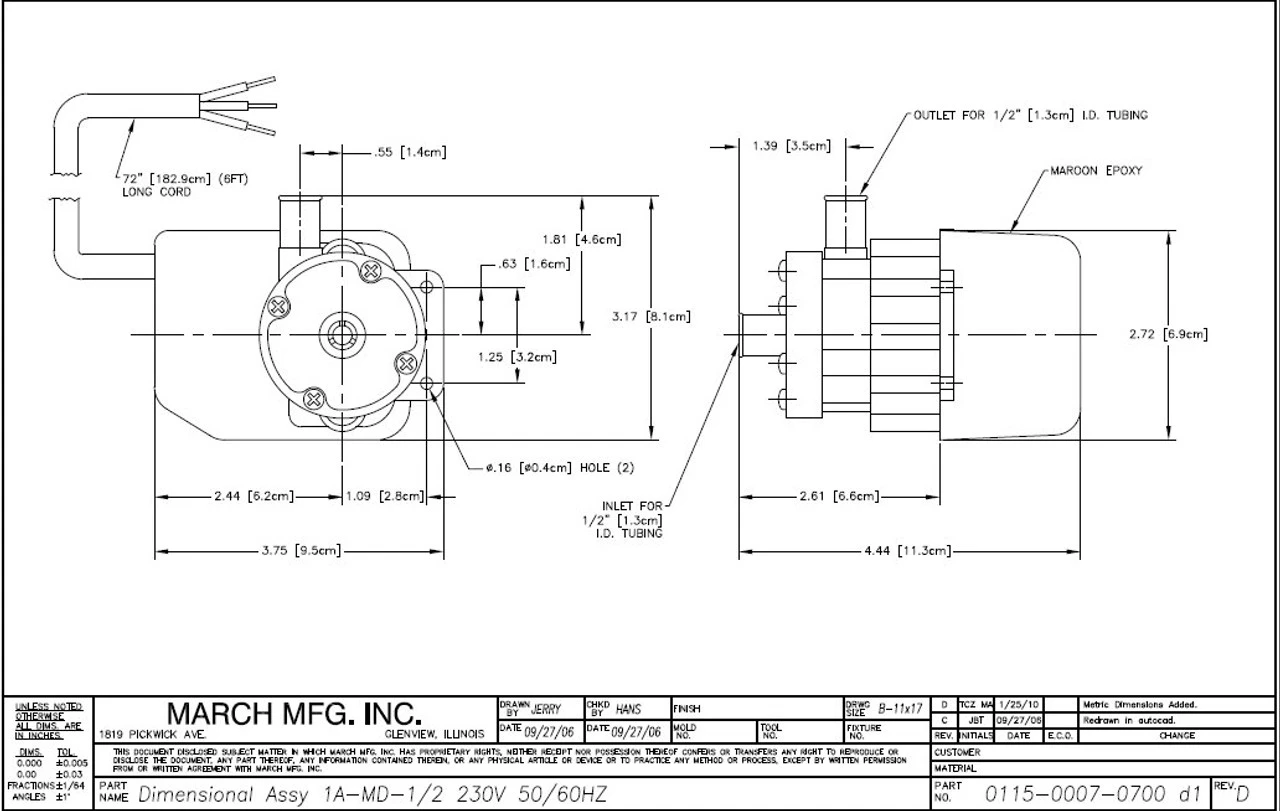March Pump’s industrial 1A-MD-1/2 is an American submersible seal-less centrifugal magnetic drive pump. It is capable of generating a maximum flow of 3 gallons per minute at 0.25 feet, and its maximum head is 4.5 Feet (2PSI). The 1A-MD-1/2 pump may be used submerged or not submerged. The standard wet end (the materials that come into contact with the solution) is composed of Polypropylene, Buna N, Nylon, Carbon/Teflon, and Stainless Steel. When submerged, Epoxy, Noryl, and the SJT Cord are also in contact with the solution. The inlet connection is 1/2 inch smooth, and the outlet is 1/2 inch smooth. The standard motor is a 1 Phase 230V 0.005 Horsepower motor, which can be run on either 50 or 60 hertz (there are performance differences between the hertz options). The maximum internal pressure the pump can tolerate is 50PSI, and the maximum liquid temperature is 190 Fahrenheit or 160 Celsius in open air, or 87 Fahrenheit or 71 Celsius if submerged. The March 1A-MD-1/2 centrifugal magnetic drive pump is capable of handling fresh water, salt water, and mild chemicals. To determine if the March 1A-MD-1/2 is suitable for your application, please contact March Pump.