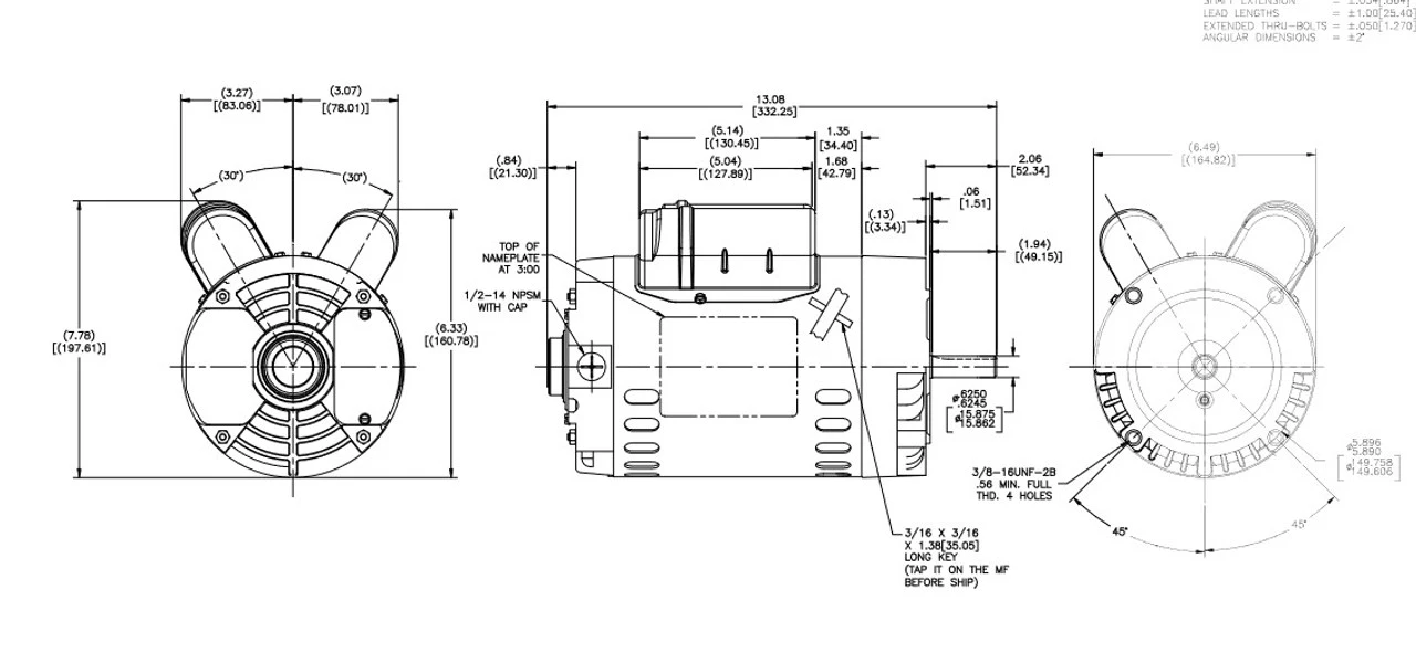 General purpose motor can be used for many applications requiring a single phase electric motor with a C-face mount. Shaft has keyway. Motor has 4 threaded bolt holes on face for mounting a pump or gear head to the motor. Bolt holes are 5 7/8″ on center measured across the shaft. Wiring diagram on motor name plate. ODP = Open Drip Proof. C445ES