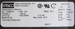 - 1/12 hp 1550 RPM, 2.5/1.3 amps, 115/230 Volts 60hz.