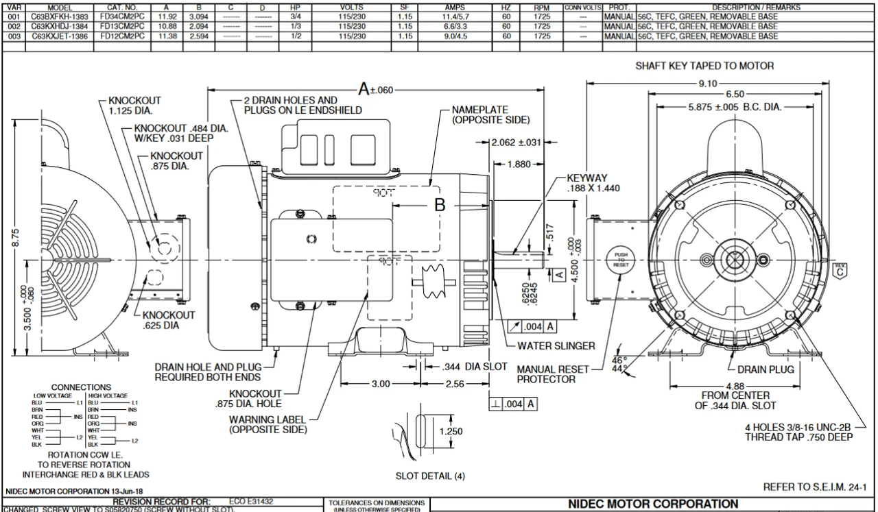 - Rigid Base Mount, Ball Bearings, Class F Insulation, CCW drive end