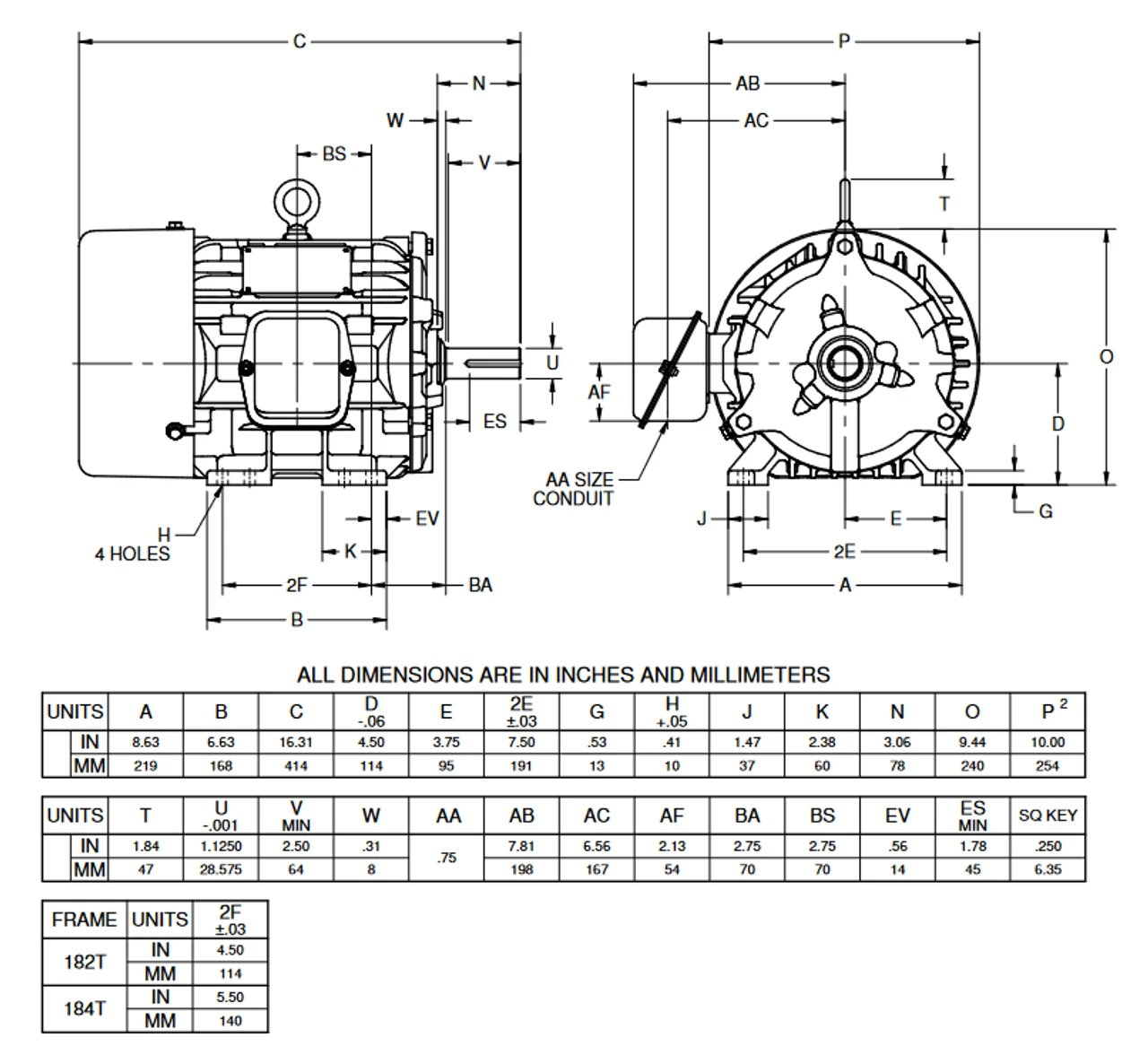 - NEMA 184T Cast Iron frame Keyed Shaft 1 1/8″ Diameter x 2 3/4″